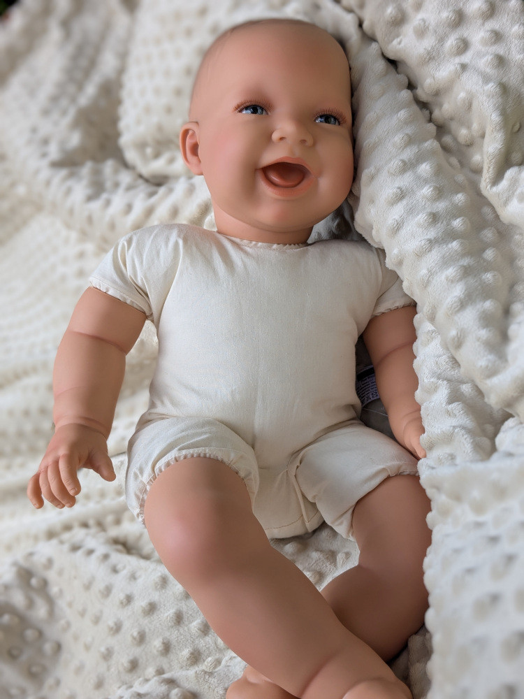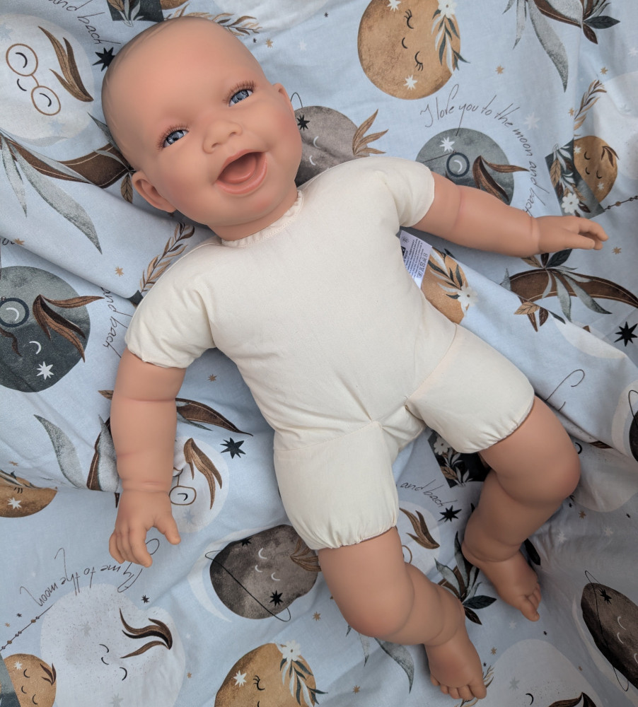 Lalka sprzedawana jest bez ubranka. Można ją ubierać w ubranka niemowlęce w rozmiarze 52/56.