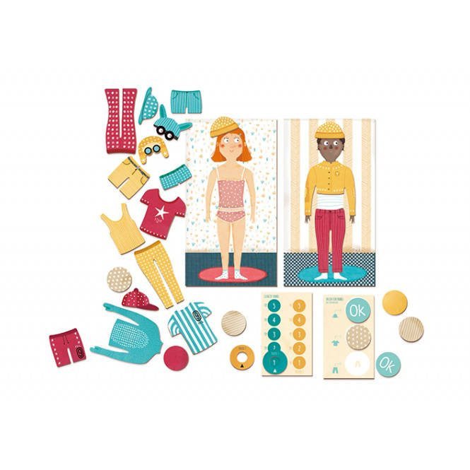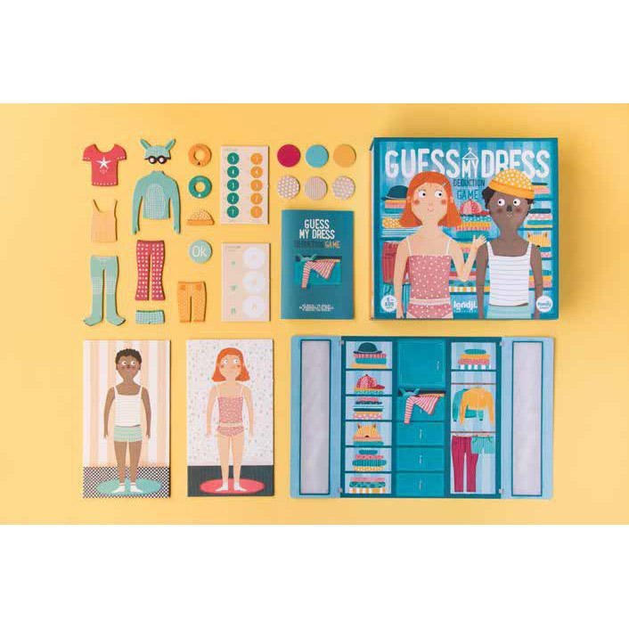 Guess my dress czyli odgadnij mój ubiór! Gra zgadywanka dla dwóch osób: za pomocą 27 kartonowych elementów ubioru przebieramy swoją postać i ukrywamy za garderobą. Zadaniem naszego przeciwnika jest odgadnięcie całego ubioru zadając pytania na które można odpowiedzieć tak lub nie.