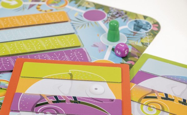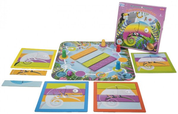 Mój własny kameleon to gra dla najmłodszych, w której celem jest ułożenie obrazka przedstawiającego kameleona. By to zrobić, gracze rzucają kostką i przesuwają pionkami po planszy w celu odnalezienia właściwych kolorów dla swojego kameleona. Wygrywa gracz, który jako pierwszy ułoży obrazek.