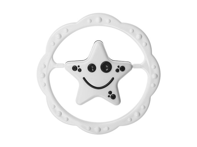 Plastikowa, czarno-biała grzechotka gwiazdka jest lekka. Kolor zabawki ćwiczy wzrok niemowlaka a jej nie duża konstrukcja wspomaga naukę chwytania. Delikatny dźwięki grzechotki stymuluje zmysł słuchu a różne struktury powierzchni rozwijają zmysł dotyku.