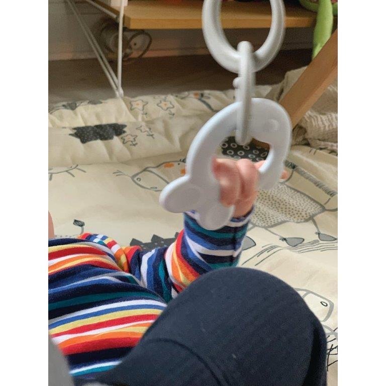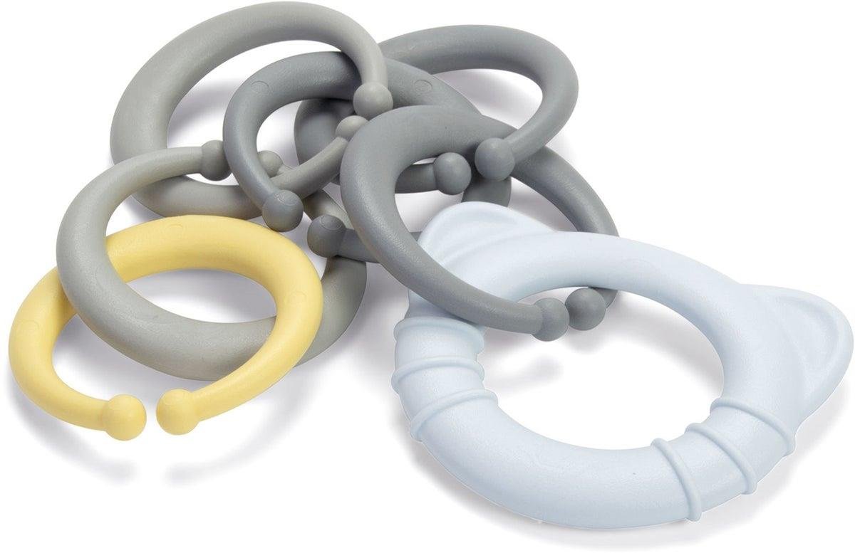 Ekologiczny gryzaczek wraz z łańcuszkiem kilku obręczy: wykonano z trzciny cukrowej i włókien bambusa. Wszystkie elementy są bezpieczne do gryzienia przez malucha, a obręcze można wykorzystać do przywieszania innych zabawek.