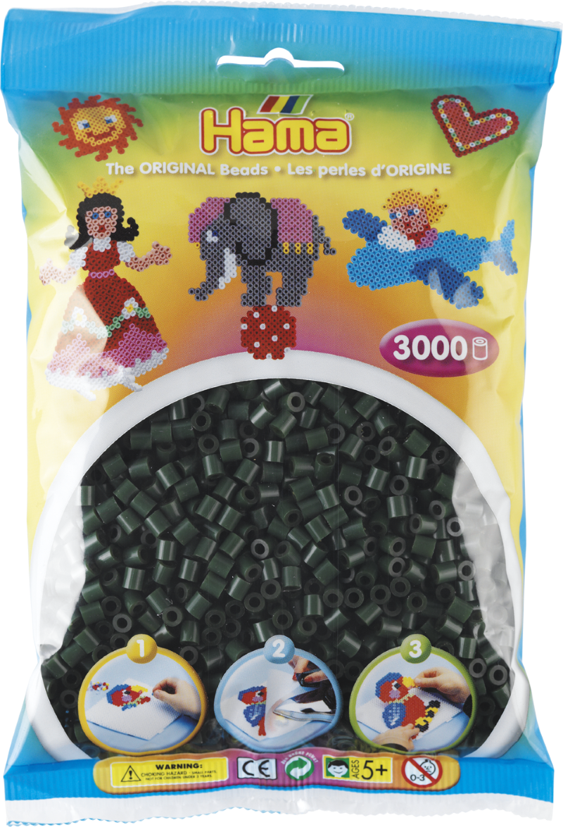 Dodatkowe koraliki Hama 201-28 Midi 5 mm dla dzieci od 5 lat w ilości 3000 sztuk w kolorze ciemnej zieleni do układanek obrazkowych Hama Midi. Z koralików w tym kolorze można ułożyć np. bransoletkę, trawę, aligatora.