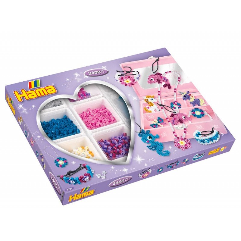 Duży zestaw koralików Hama w rozmiarze midi, zawiera aż 2400 różnokolorowych koralików, sorter na koraliki, podkładki, instrukcję, ozdobne kryształki, instrukcję, sznureczki oraz papier do zaprasowywania.