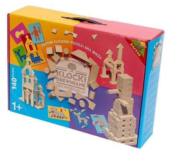 Duże, ekologiczne klocki drewniane zapakowane w kartonowe opakowanie z rączką. Zestaw zawiera 140 elementów, z których dziecko będzie mogło stworzyć wiele konstrukcji.