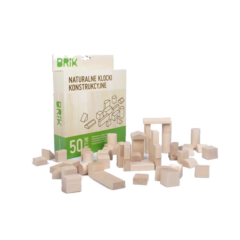 Komplet drewnianych klocków zawiera 50 sztuk naturalnych drewnianych klocków z drewna bukowego w kartonowym opakowaniu. Drewniane klocki są ekologiczne, wykonane z bez sękowego drewna bukowego I jakości i nie zawierają żadnych konserwantów.