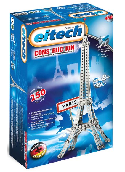 Zestaw pozwalający na złożenie metalowego modelu wieży Eiffla. W zestawie aż 250elementów, w tym blaszek, podłużnych łączeń, śrubek, wkrętek, nakładek oraz potrzebnych narzędzi. Wysokość wieży po złożeniu 45 cm.