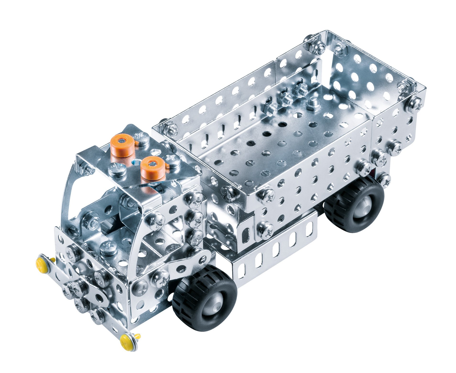 Zestaw pozwalający na złożenie metalowego modelu wywrotki. W zestawie aż 190 elementów, w tym blaszek, podłużnych łączeń, śrubek, wkrętek, nakładek oraz potrzebnych narzędzi.