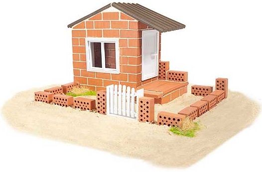 - Zestaw zawiera ceramiczne cegiełki, cement, podkładkę, plany budowlane, miseczkę i kielnię.