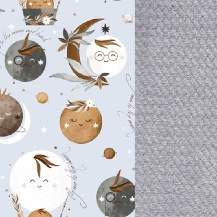 Z jednej strony bawełna wzór Fly me to the moon Sky, z drugiej velvet w kolorze dark grey.