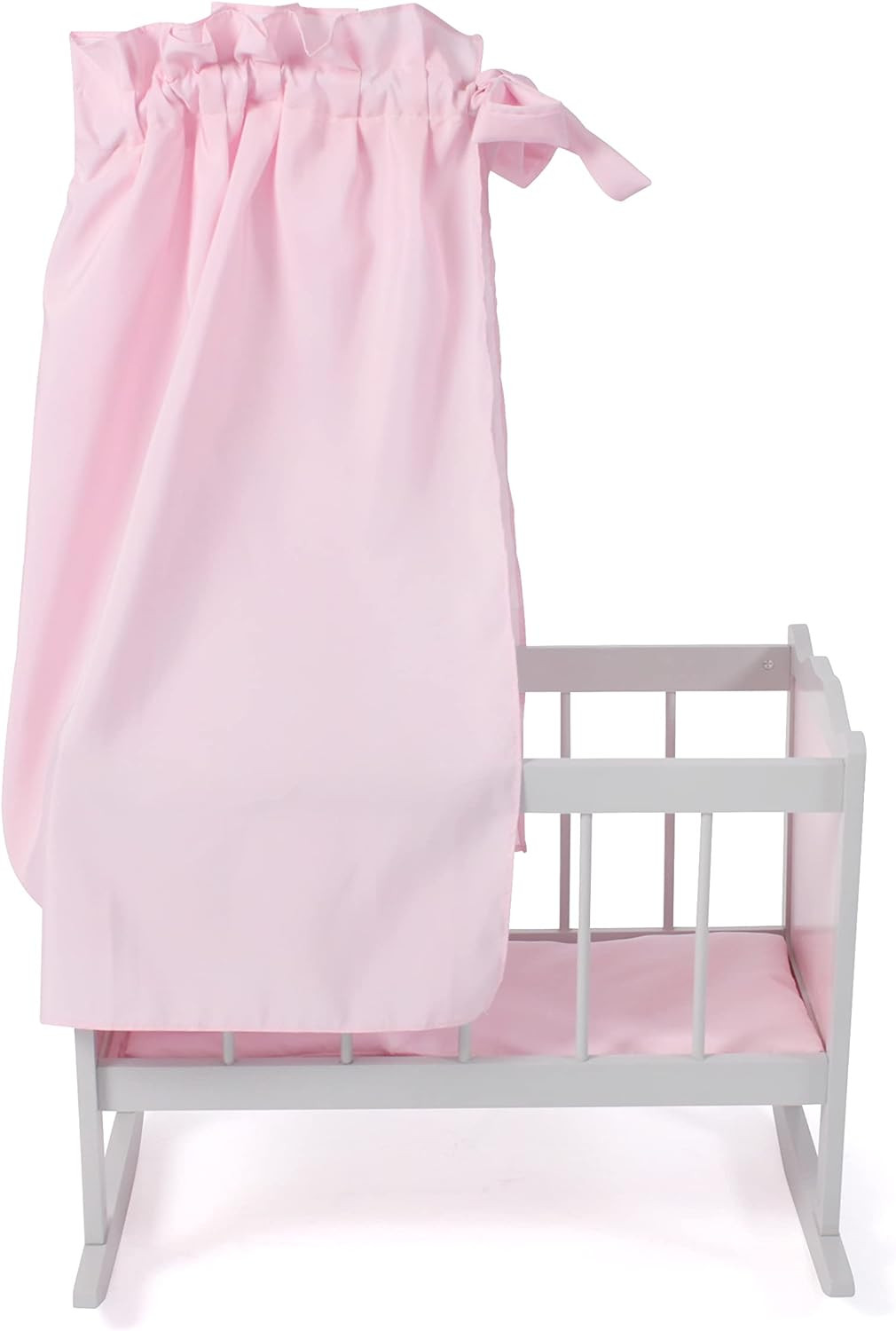 Duża kołyska dla lalek w rozmiarze do 46 cm długości. W zestawie z kołyską jest baldachim, poduszka, kołdra oraz materac. Kołyska wykonana została z przyjaznego dla środowiska materiału MDF, i jest pomalowana bezpiecznymi dla dziecka farbami.
