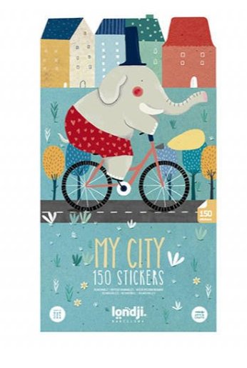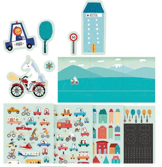 Zestaw Moje miasto zawiera naklejki przedstawiające: budynki, ulice, znaki drogowe, drzewa postacie w różnych środkach transportu (auta, rowery, motocykle itp.)