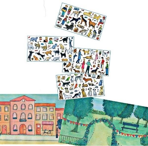 Kreatywne wyklejanie - w zestawie znajdziemy 4 kolorowe plansze, 4 arkusze na których znajdziemy 137 postaci zwierzaków oraz drewniany patyczek. Wybieramy postać z arkusza, za pomocą patyczka delikatnie wycinamy i odklejamy element a następnie umieszczamy w dowolnym miejscu na planszy.