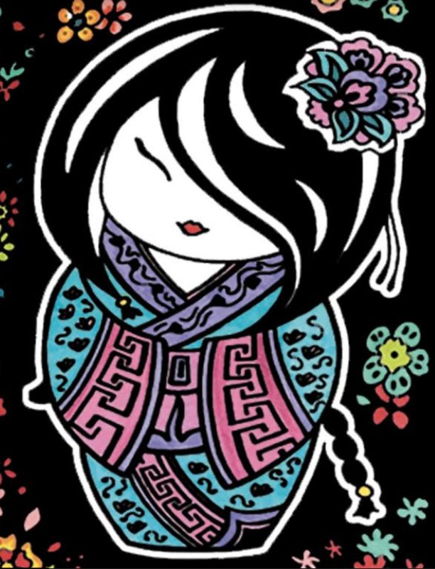 Notatnik welwetowy w formacie A5 z laleczkami kokeshi na okładce. Okładkę notatnika można pokolorować pisakami lub kredkami. Dzięki velvetowym obrysom trudno wyjść poza linię przy kolorowaniu, a czarne tło nadaje wyrazistości całemu obrazkowi.