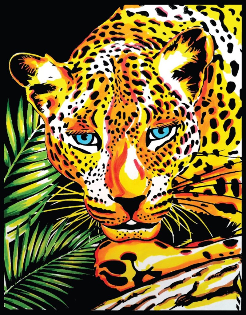 Plakat o wymiarach 47x35cm z wizerunkiem leoparda. Welwetowe kontury ułatwiają malowanie, a czarne tło sprawia, że kolory są bardzo wyraziste.