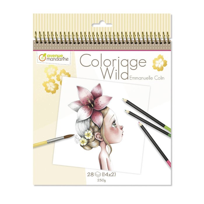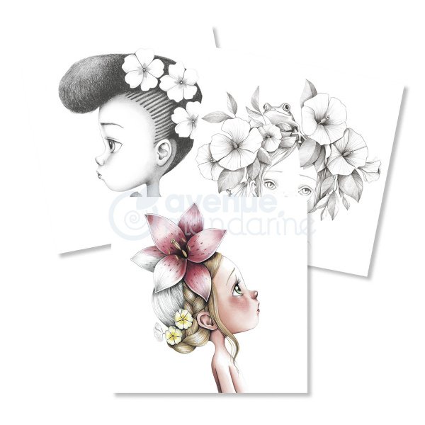 W środku znajdziemy 14 rysunków powtórzonych dwukrotnie przedstawiających subtelne portrety dziewczynek związanych z naturą. Kartki są grube, możemy na nich malować kredkami lub farbami akwarelowymi.