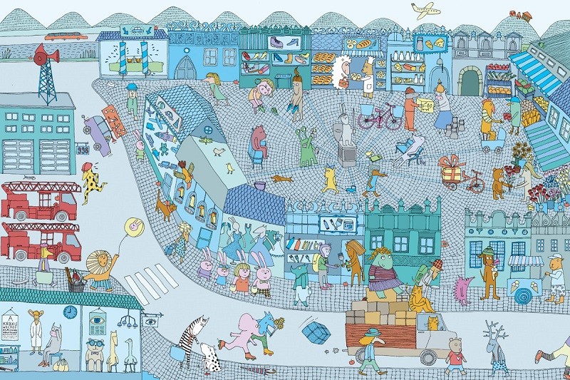 Każda rozkładówka to prześlicznie narysowana panorama fragmentu tytułowego miasteczka.