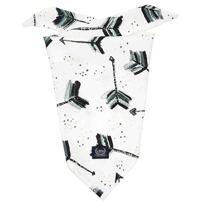 Bajeczna trójkątna chustka w czarne strzały na głowę z miękkiej, przepuszczającej powietrze bawełny. Chroni główkę przed wiatrem i słońce, pozwalając skórze dziecka oddychać.