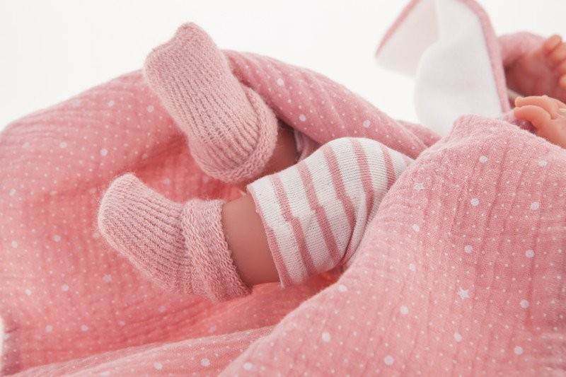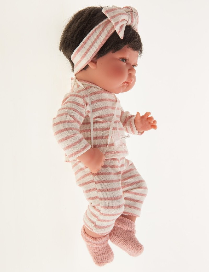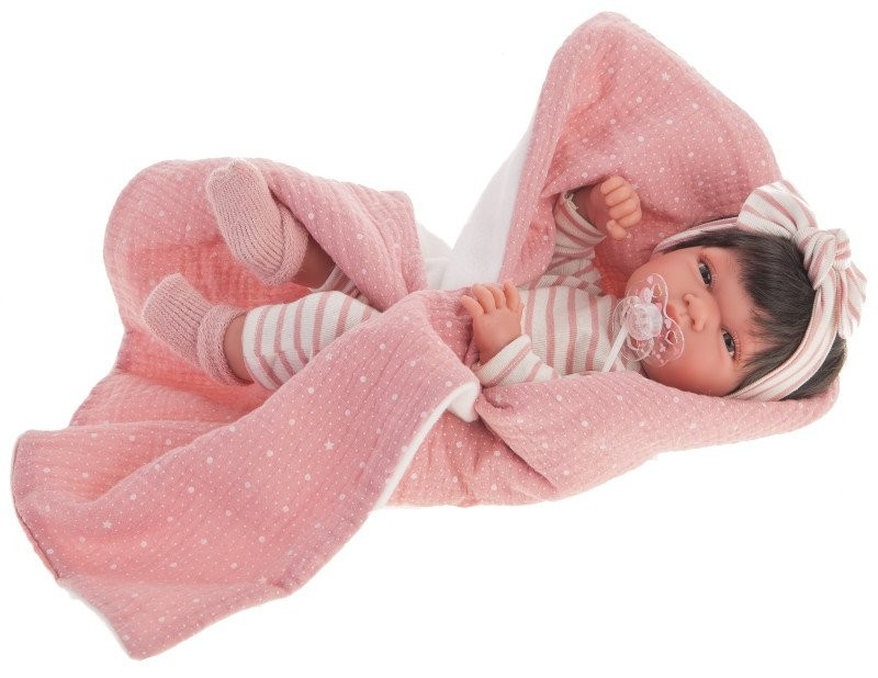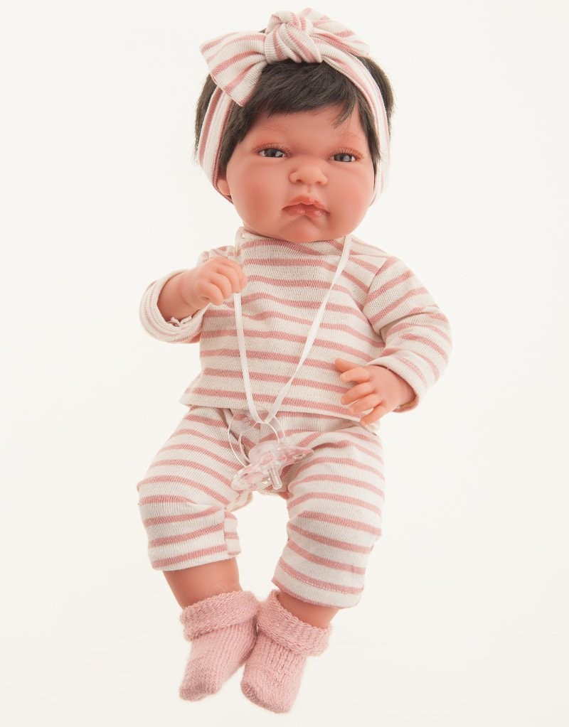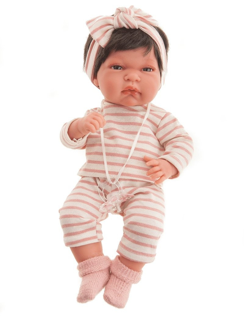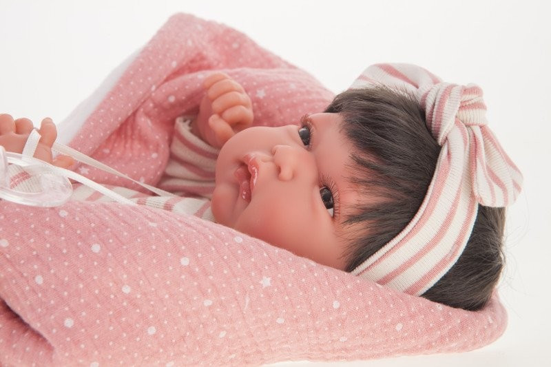 Lalka noworodek (Recién Nacido Baby) w całości wykonana z miękkiego winylu. Laleczka ma zaznaczoną płeć, jest dziewczynką o ślicznych brązowych włosach i oczach. Ten uroczy bobas ma ruchome rączki, nóżki i główkę. Mierzy 33 cm.