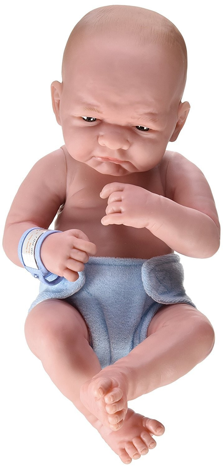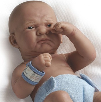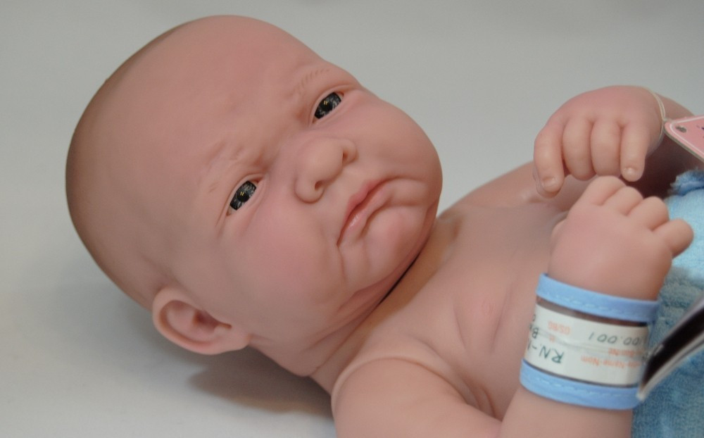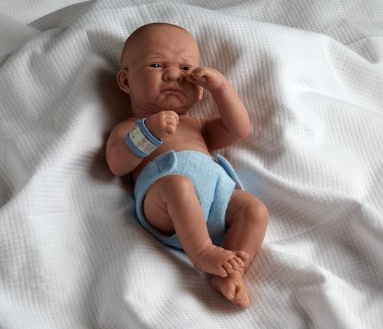 Lalka wygląda jak prawdziwy noworodek, ma zmarszczoną w płaczu buźkę i ubrana jest w pieluszkę koloru niebieskiego.