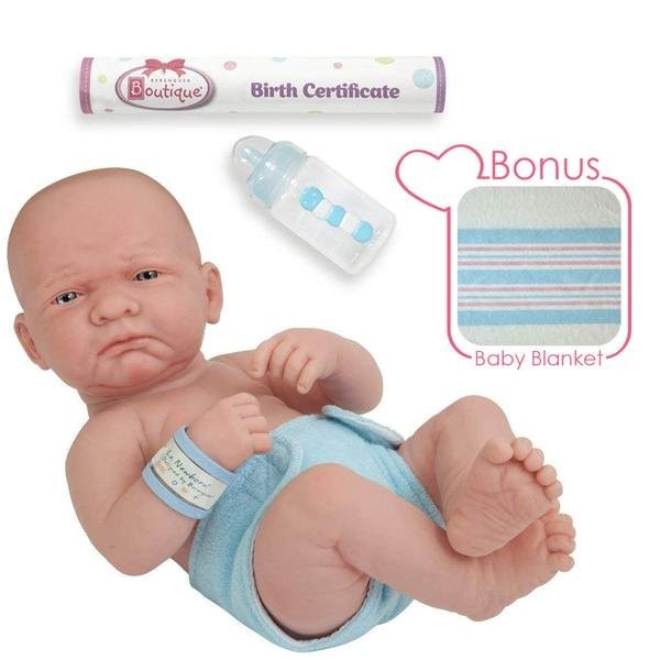 Śliczny bobas chłopczyk wygląda bardzo realistycznie, jak prawdziwe dziecko, jak prawdziwy noworodek. Laleczka ma zapłakaną buźkę. Na rączce bobasek ma opaskę szpitalną. W zestawie także kocyk, akt urodzenia, niebieska pieluszka oraz butelka do karmienia.