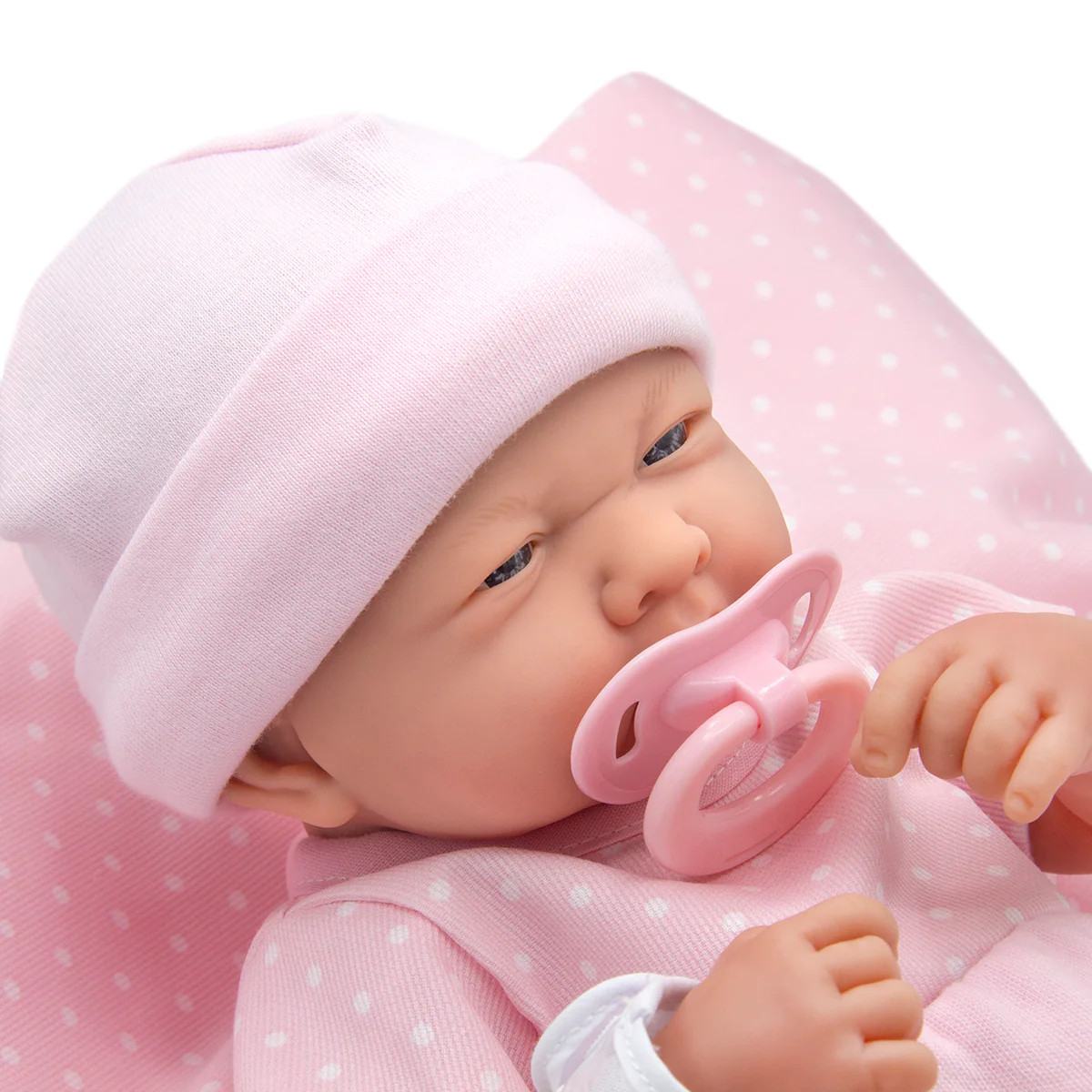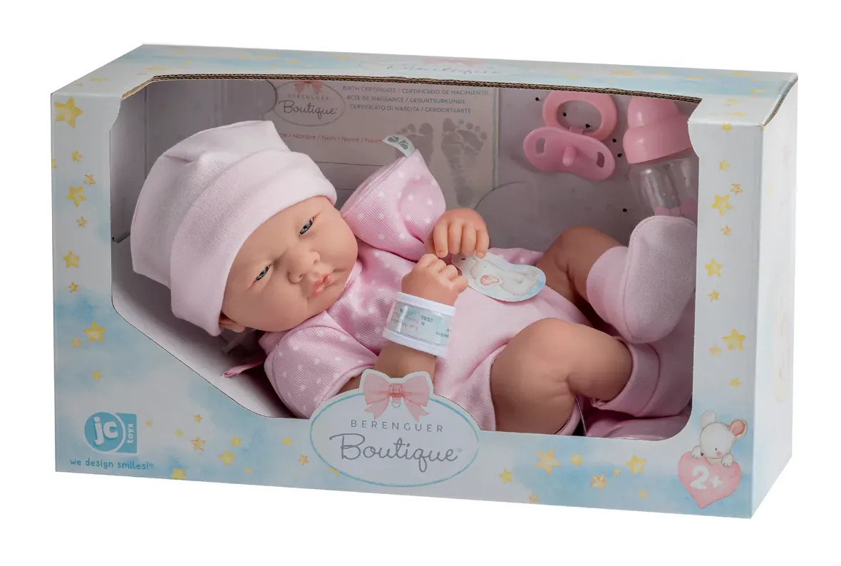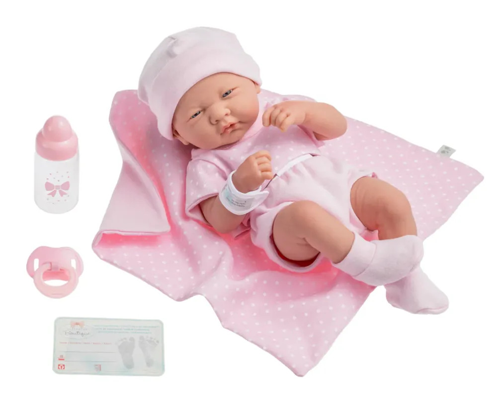 - dodatkowo w komplecie do lalki dołączony jest różowy kocyk, smoczek, butelka do karmienia,