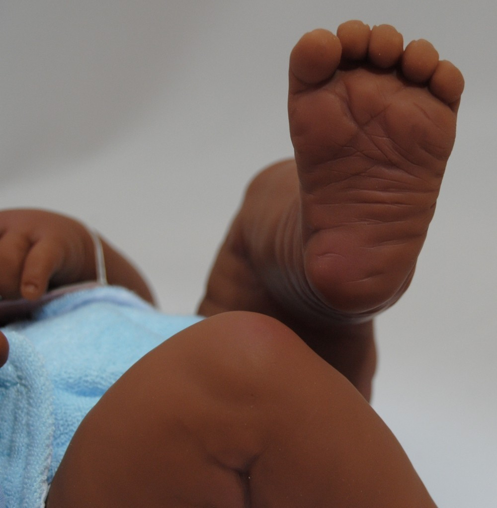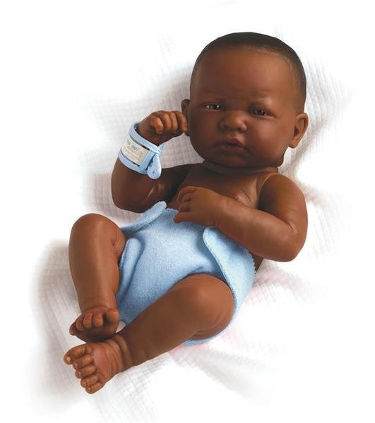 Czarnoskóry noworodek chłopczyk, który wygląda jak prawdziwe dziecko. Lalka ma na sobie niebieską pieluszkę (pod nią opatrunek na pępuszek) oraz opaskę szpitalną.W zestawie także akt urodzenia do wypełnienia, kocyk oraz butelka do karmienia.