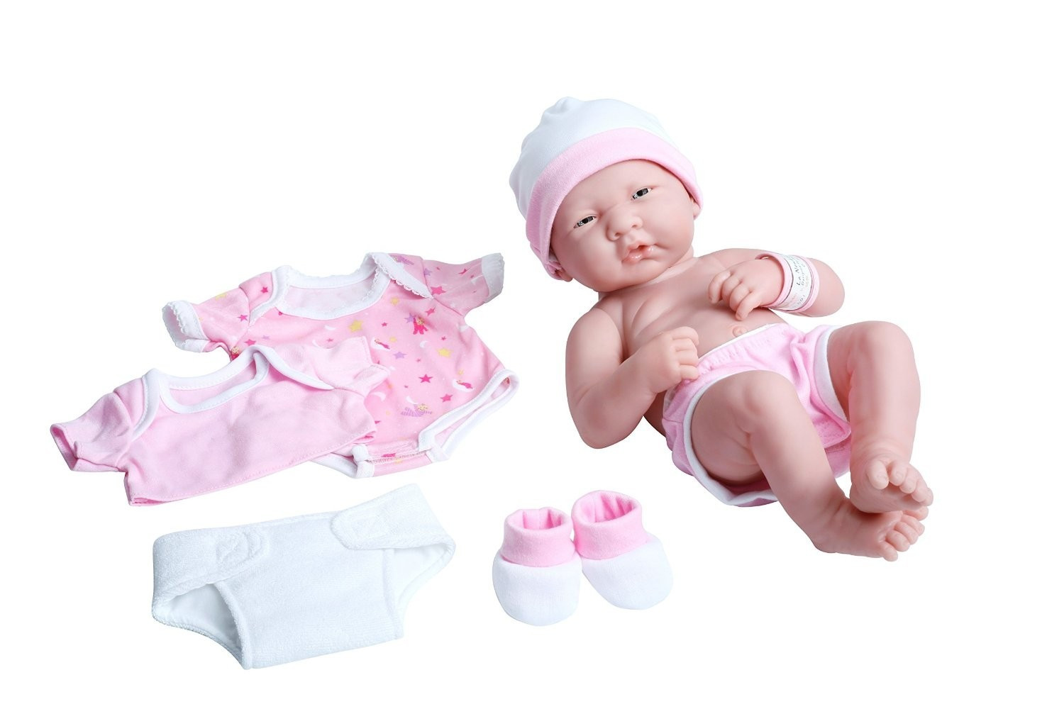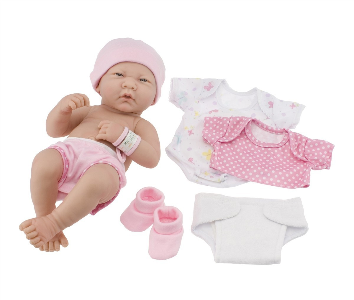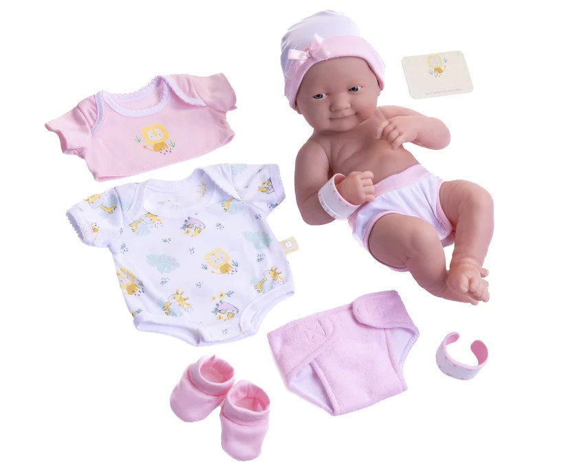 Ubieranie lalek nigdy nie było łatwiejsze. Ta piękna lalka bobas jest ubrana w majtusie oraz śliczną czapeczkę. W zestawie również body na zmianę, krótka bluzeczka, materiałowe buciki, pieluszka na rzepy oraz opaska szpitalna na rączce. Doskonała lalka do ubierania!