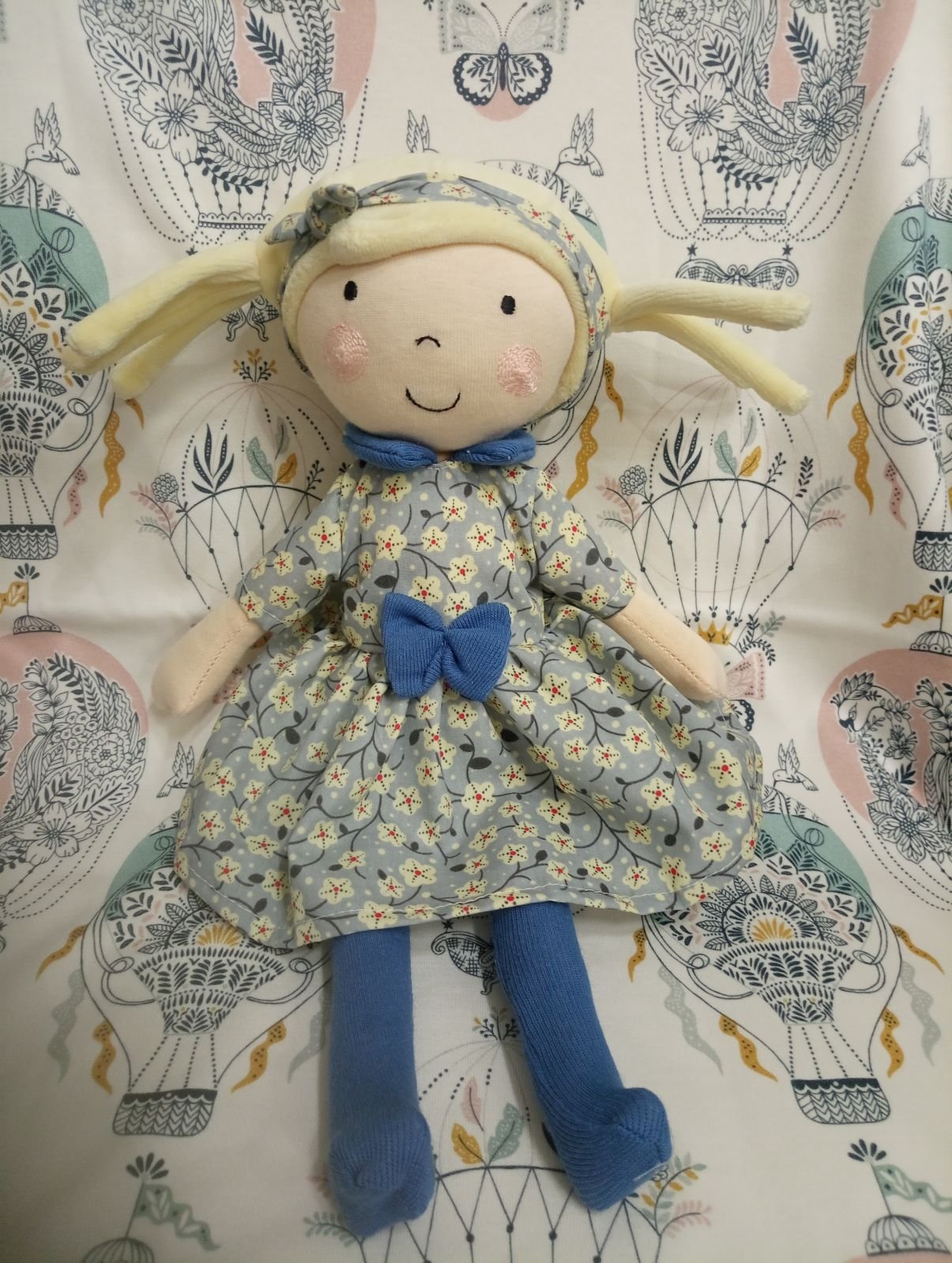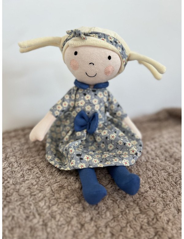 Śliczna, ręcznie wykonana lalka o imieniu Hania. Hania jest uśmiechniętą blondynką o ciemnych oczkach. Hania ubrana jest w sukieneczkę w kwiatki, niebieskie rajstopki oraz pasującą opaskę na główce.