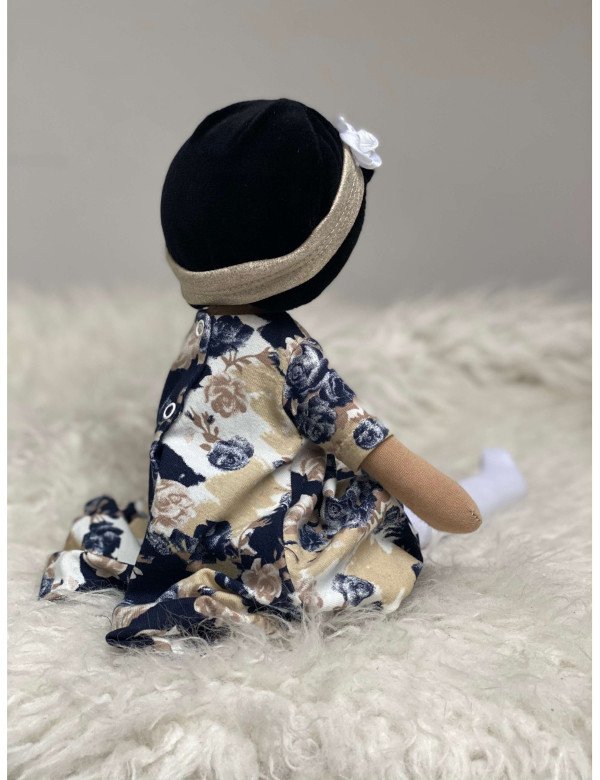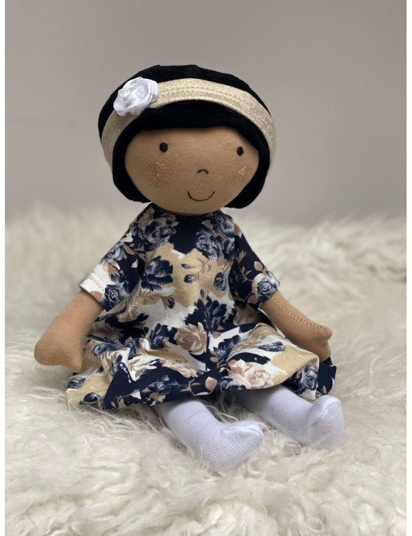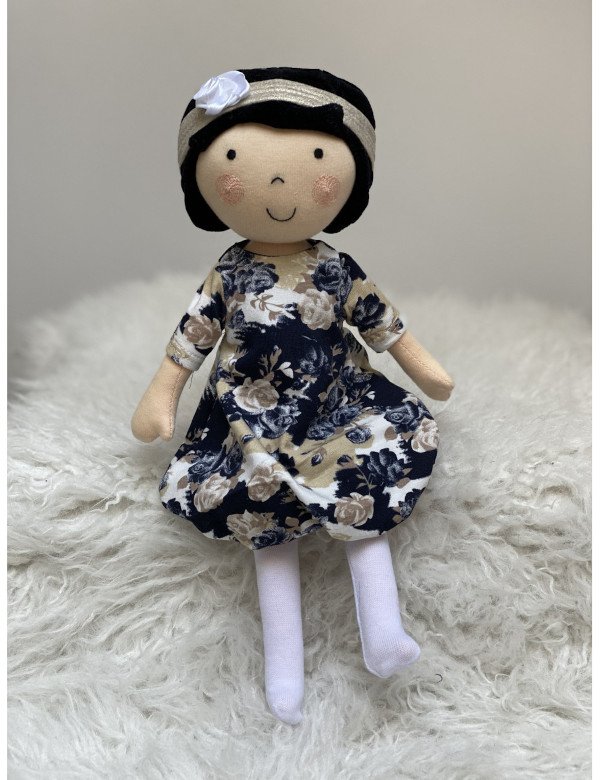 Śliczna, ręcznie wykonana lalka o imieniu Ada. Ada jest uśmiechniętą szatynką o ciemnej karnacji. Lalka ubrana jest w sukieneczkę w kwiatki, złotą opaskę z kwiatuszkiem oraz białe rajstopki.