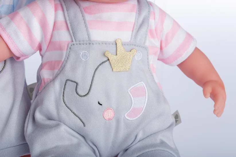 Ubranka lalek dokładnie jak na zdjęciu: jednoczęściowy pajacyk ze słonikiem na nogawce oraz czapeczka (chłopczyk niebieskie ubranko, dziewczynka różowe ubranko)