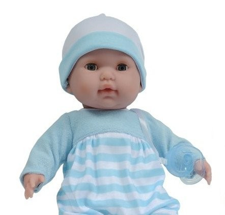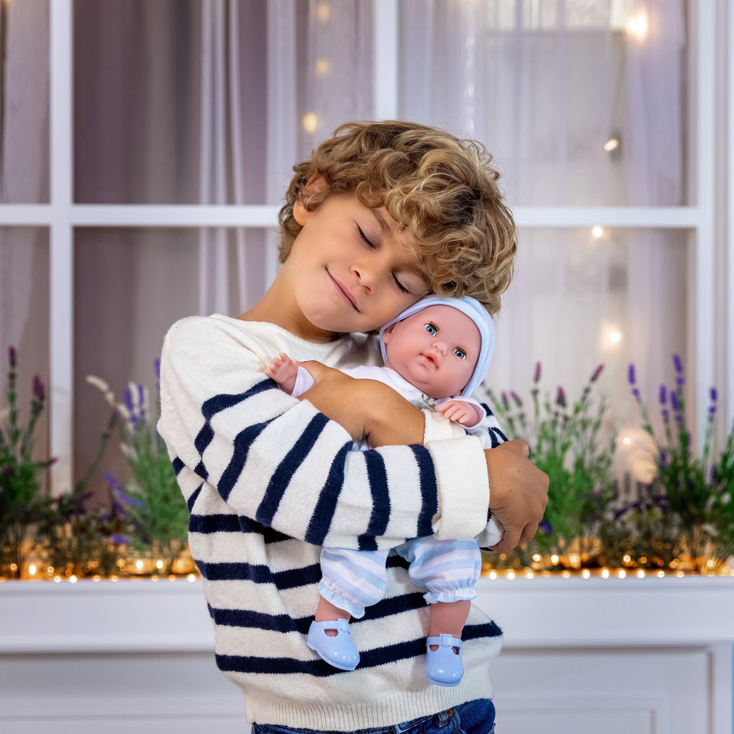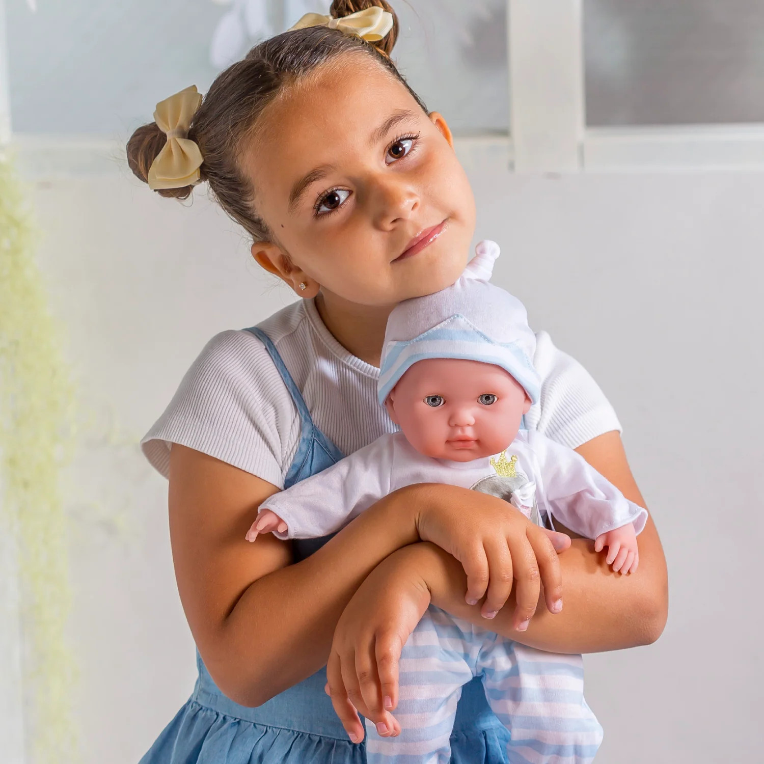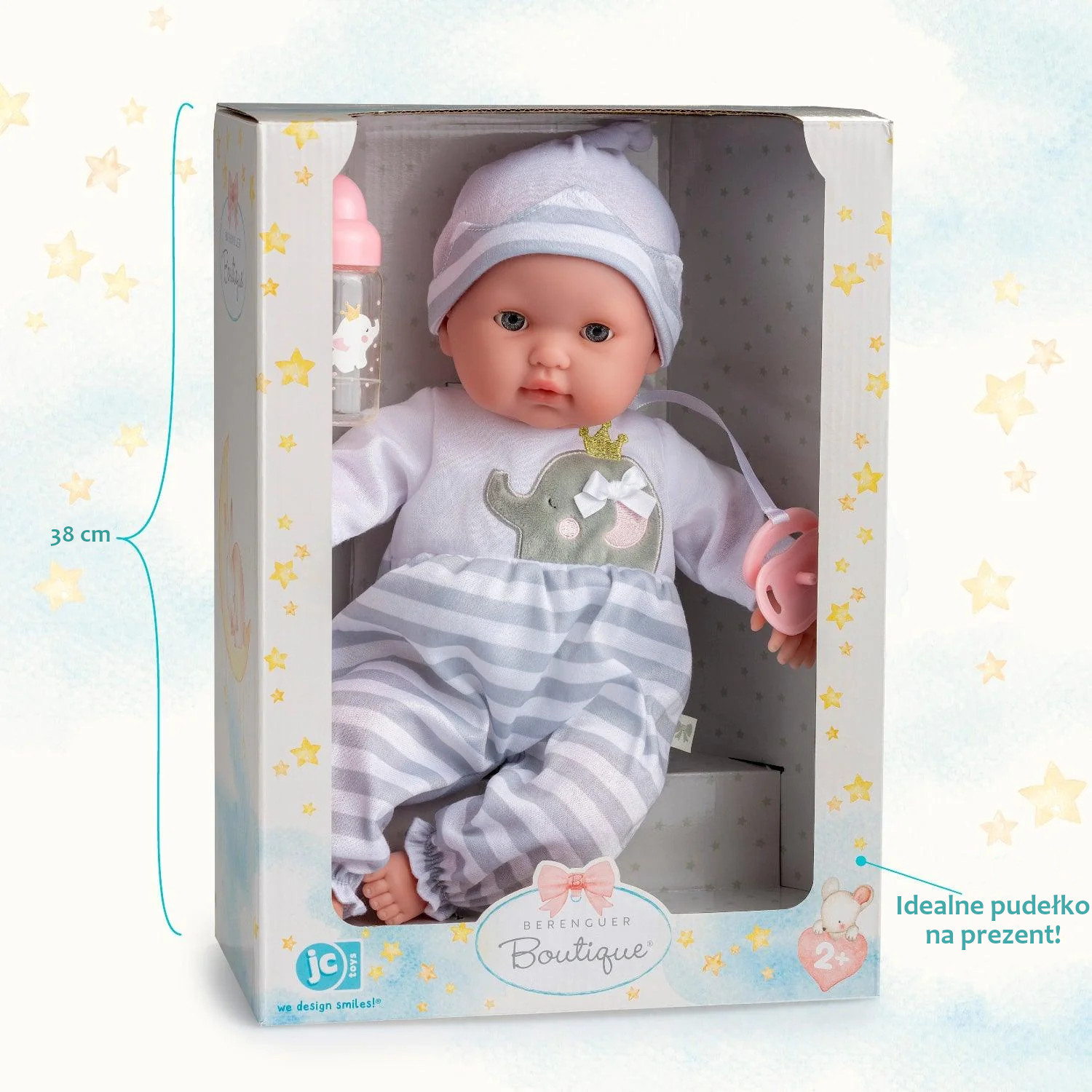 Śliczna lalka dzidziuś z miękkim brzuszkiem. Z winylu jest głowa, rączki oraz nóżki. W zestawie liczne akcesoria: smoczek, dodatkowe ubranko, buciki, grzechotka, butelka oraz talerz plus sztućce. Laleczka ma oczy które się zamykają.
