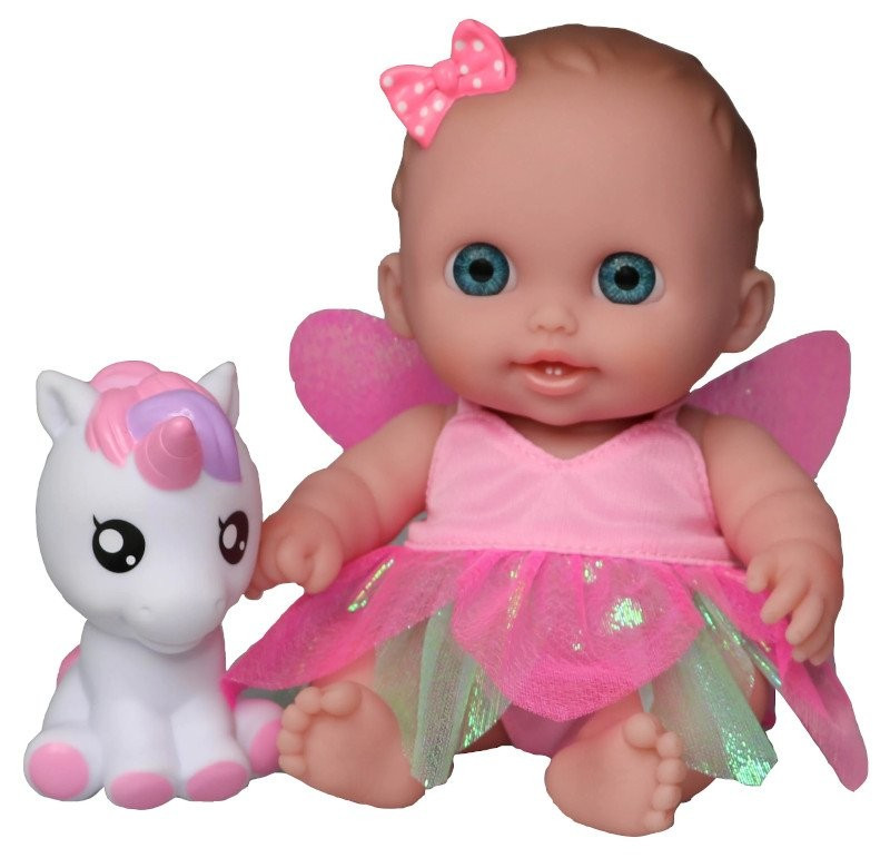 Piękna mała laleczka w stroju wróżki. W zestawie także mały, gumowy jednorożec. Laleczka w całości wykonana jest z winylu. Ma ruchomą główkę, rączki i nóżki.