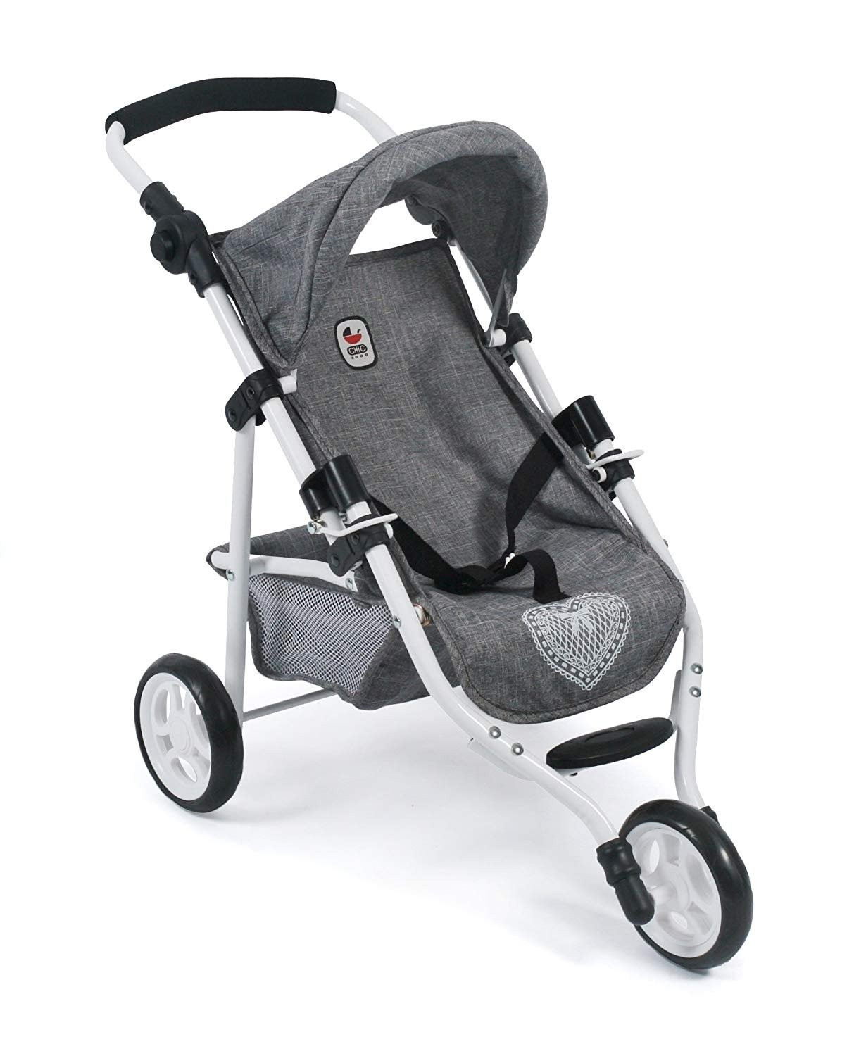 Wózeczek spacerówka dla lalek firmy Bayer Chic 2000, model Lola w kolorze szarego jeansu. Wózek ma wyhaftowane serduszko z kokardką.