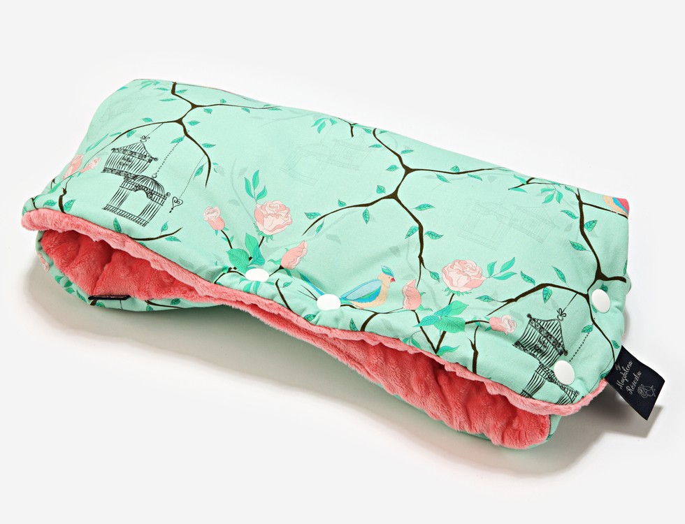 Mufka została wykonana z jednej strony z polarka minky (kolor koralowy) oraz z drugiej strony z bawełny wzór maggie rose mint. W środku umieszczono również impregnowany ortalion dzięki któremu mufka pozostanie sucha nawet w deszczowy dzień.