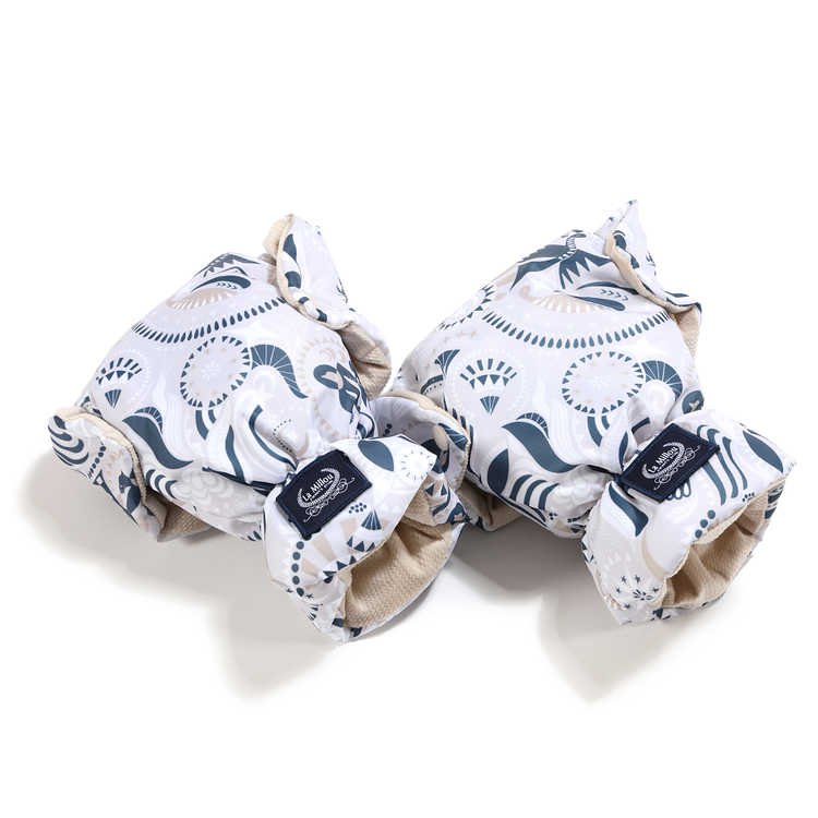 Zewnętrzna warstwa mufki wykonana została z wodoodpornego ortalionu we wzorze Dune, zaś wewnętrzna z miękkiego velvetu w kolorze Sand.