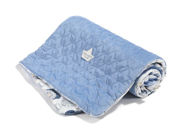 Dwustronna narzutka i kocyk w jednym o wymiarze 110 x 140 cm. Z jednej strony tkanina velvet w kolorze Dove Blue, z drugiej bawełniany wzór Cappadocia Sky.