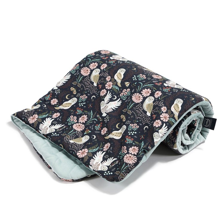 Dwustronna narzutka i kocyk w jednym o wymiarze 110 x 140cm. Z jednej strony tkanina velvet w kolorze smoke mint, z drugiej bawełniany wzór Magic Owl.