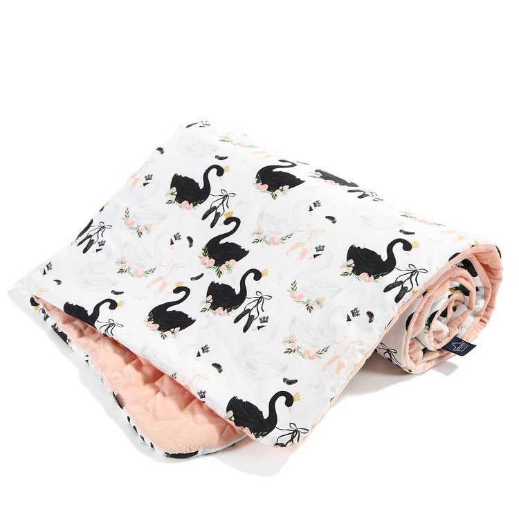 Dwustronna narzutka i kocyk w jednym o wymiarze 110 x 140cm. Z jednej strony tkanina velvet w kolorze Powder pink, z drugiej bawełniany wzór Moonlight Swan.
