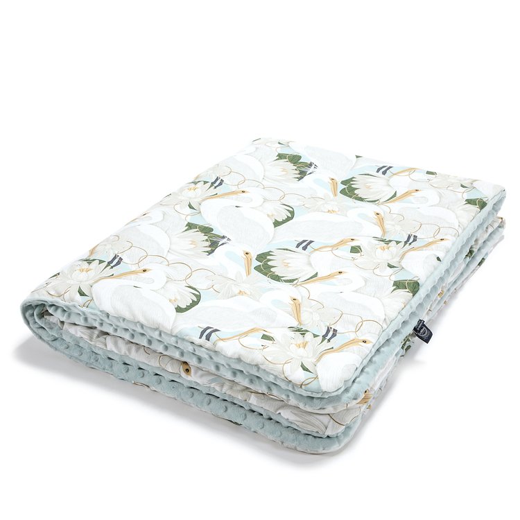 Dwustronna narzutka i kocyk w jednym o wymiarze 110 x 140 cm. Z jednej strony tkanina minky w kolorze Smoke Mint, z drugiej bawełniany wzór Heron in a Cream Lotus.