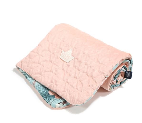 Dwustronna narzutka i kocyk w jednym o wymiarze 110 x 140cm. Z jednej strony tkanina velvet w kolorze Powder Pink, z drugiej bawełniany wzór Boho Palms.