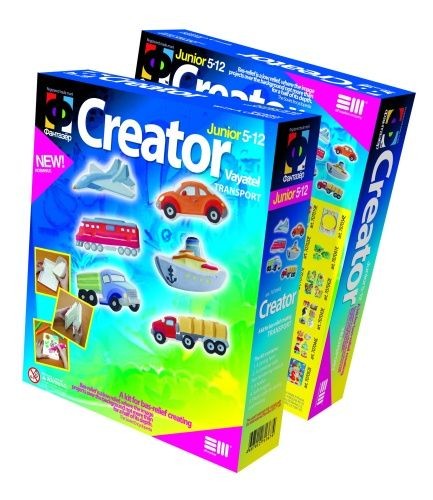 Zestaw kreatywny z akcesoriami do wykonania obrazków gipsowych o tematyce: pojazdy, środki transportu.