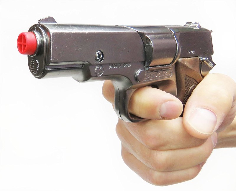 Metalowy Pistolet na kapiszony w kolorze srebra. Pistolet w całości wykonany jest z metalu, wiernie oddaje szczegóły dziękie czemu wygląda jak prawdziwy. Magazynek jest na 8 sztuk kapiszonów tzw. 8-semek. Magazynek wysuwa się ku górze.