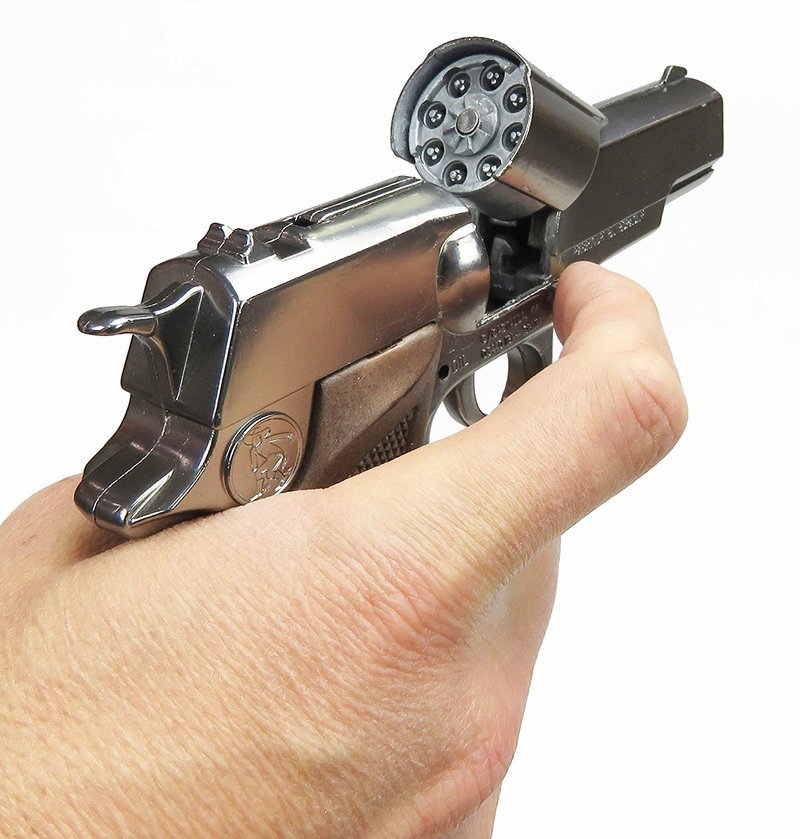 Po naciśnięciu bocznego przycisku z korpusu wysuwa się ku górze magazynek na 8 sztuk kapiszonów osadzonych w pierścieniu 125 decybeli (klaśnięcie w dłonie).