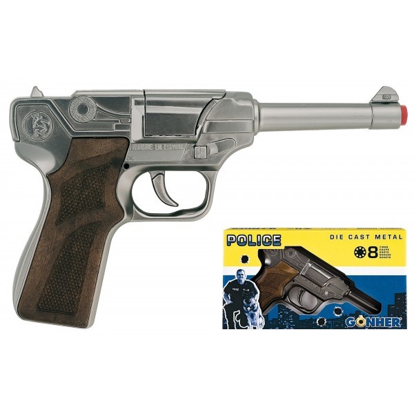 Policyjny Pistolet na kapiszony w kolorze starego srebra. Pistolet w całości wykonany jest z metalu, wiernie oddaje rzeczywisty jego odpowiednik. Zabawka w całości wykonana jest w Hiszpanii.