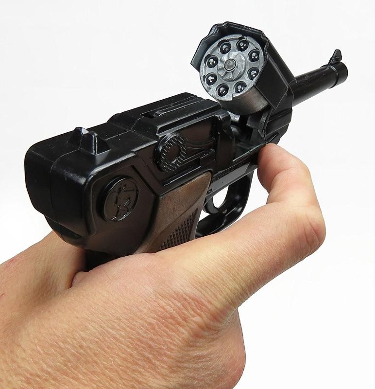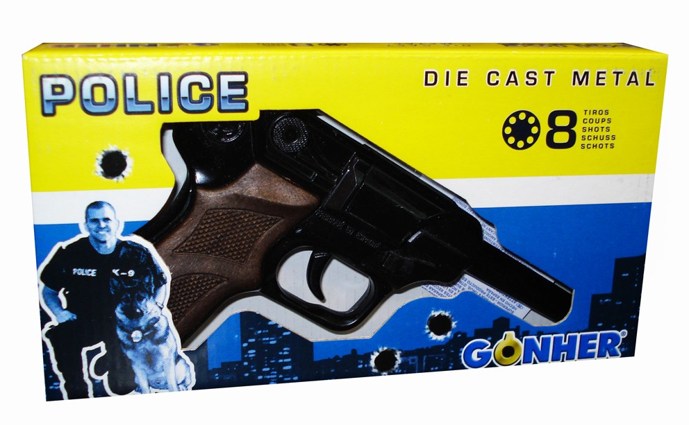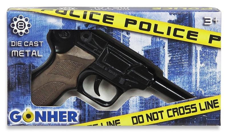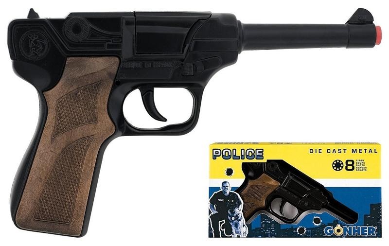 Policyjny Pistolet na kapiszony w czarnym kolorze. Pistolet w całości wykonany jest z metalu, wiernie oddaje rzeczywisty jego odpowiednik. Zabawka w całości wykonana jest w Hiszpanii. Pistolet jest 8 strzałowy.