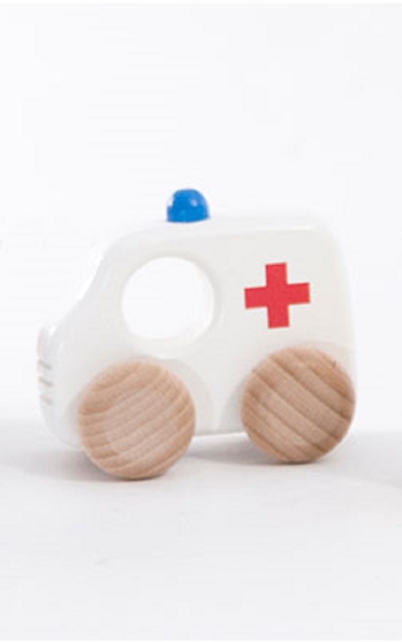 Drewniana zabawka, która przetrwa próbę czasu - solidnie i estetycznie wykonana karetka pogotowia dla najmłodszych dzieci. Jakość gwarantowana przez firmę Bajo z Kamionnej.