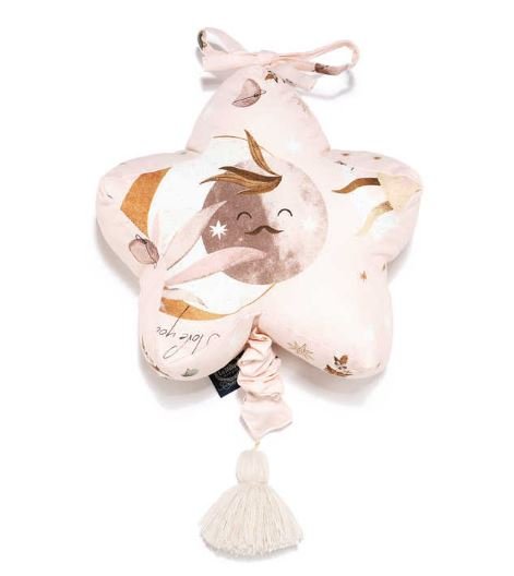 Pozytywka w kształcie gwiazdki, wzór Fly me to the Moon Nude. Troczki w górnej części, umożliwiają łatwe przywiązanie pozytywki do łóżeczka. Sznurek w dolej części pozytywki jest zakończony frędzelkiem.