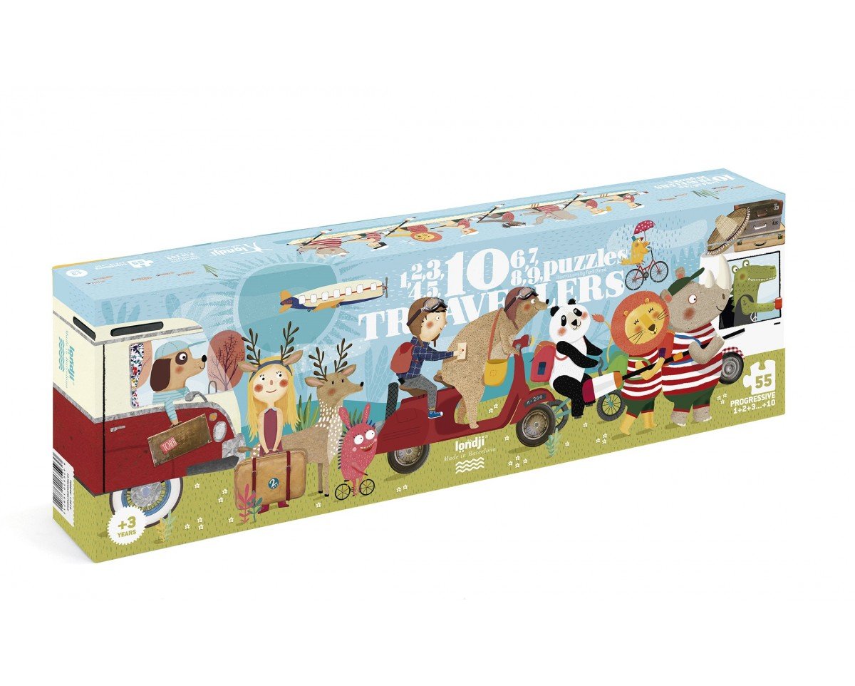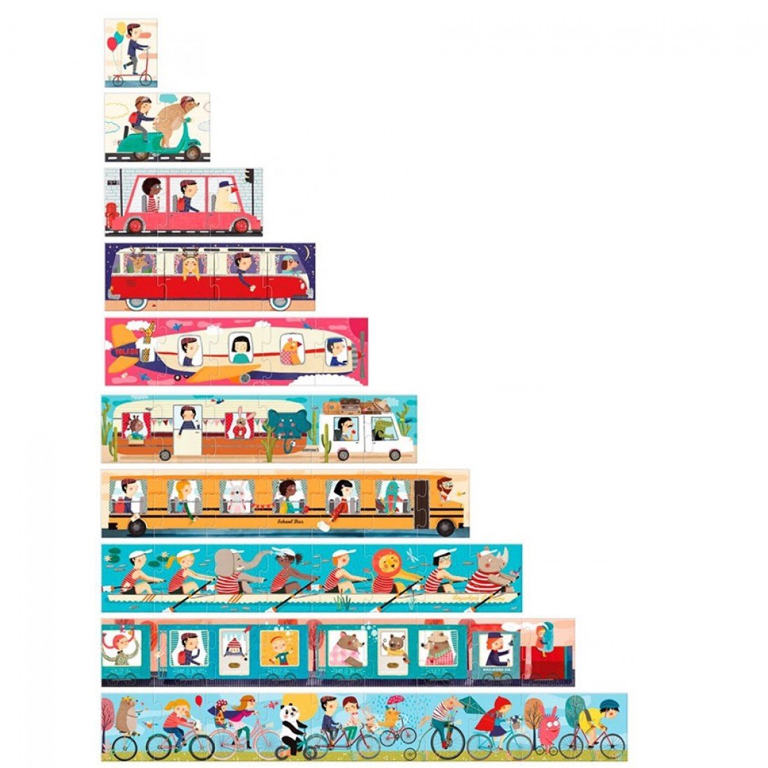 Duże puzzle do nauki liczenia: tylko jeden Pan porusza się na hulajnodze, za to w pociągu mamy aż 9ciu pasażerów!!! Ułóż puzzle tworząc piramidkęz podróżnych od 1 do 10.
