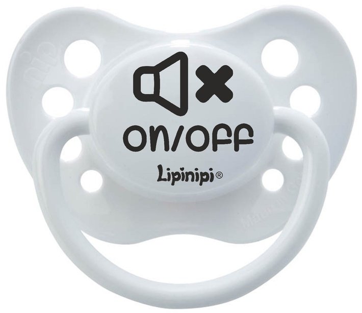 Smoczek dla niemowlaka z napisem On/off. Smoczek dla chłopczyka, jak i dziewczynki w biało-czarnej kolorystyce. Dostępne dwa rozmiary smoczków: od 0 do 6 m oraz od 6 do 18 miesięcy.