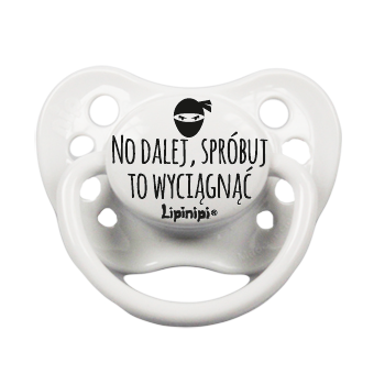Smoczek dla niemowlaka z humorystycznym napisem No dalej spróbuj to wyciągnąć. Kolor: biały, rysunek: ninja